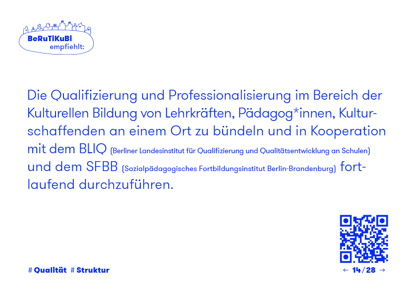 Qualifizierung: Als Kompetenzstelle bündelt, vernetzt und koordiniert die Struktur zum Beispiel in Kooperation mit dem BLIQ, dem SFBB oder anderen Weiterbildungsträger*innen Qualifizierungsangebote der Kulturellen Bildung für Lehrkräfte, Pädagog*innen und Kulturschaffende. So können Lücken identifiziert sowie neue Angebote initiiert und entwickelt werden