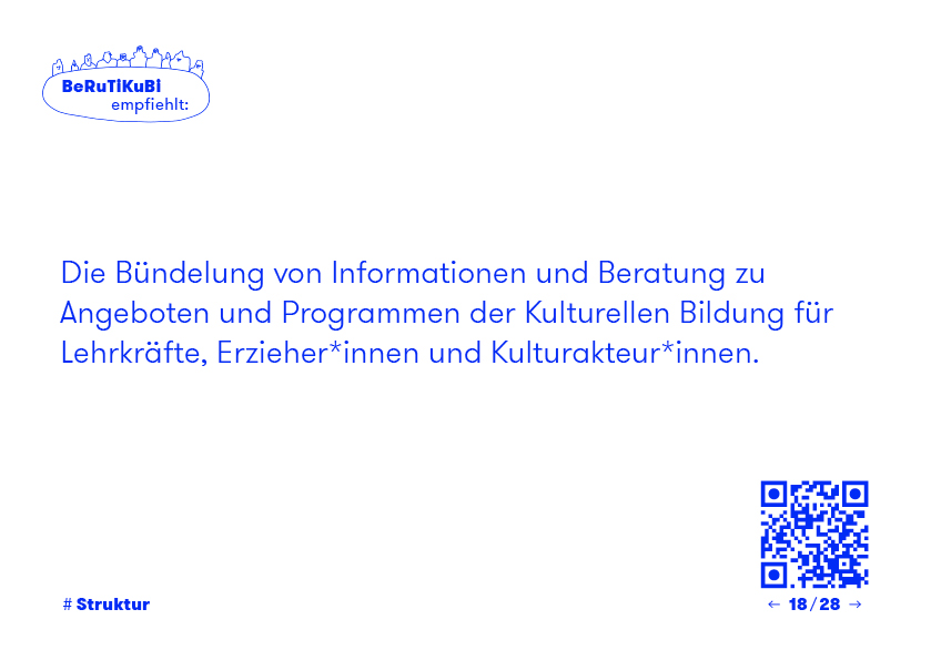 Qualifizierung: Als Kompetenzstelle bündelt, vernetzt und koordiniert die Struktur zum Beispiel in Kooperation mit dem BLIQ, dem SFBB oder anderen Weiterbildungsträger*innen Qualifizierungsangebote der Kulturellen Bildung für Lehrkräfte, Pädagog*innen und Kulturschaffende. So können Lücken identifiziert sowie neue Angebote initiiert und entwickelt werden.