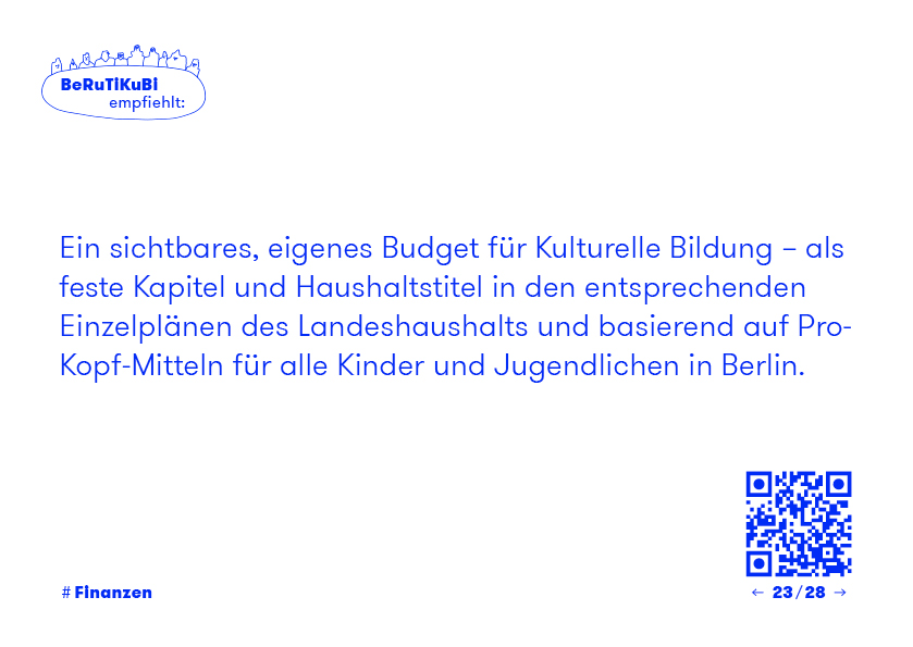 Ein sichtbares, eigenes Budget für Kulturelle Bildung – als feste Kapitel und Haushaltstitel in den entsprechenden Einzelplänen des Landeshaushalts und basierend auf Pro-Kopf-Mitteln für alle Kinder und Jugendlichen in Berlin.