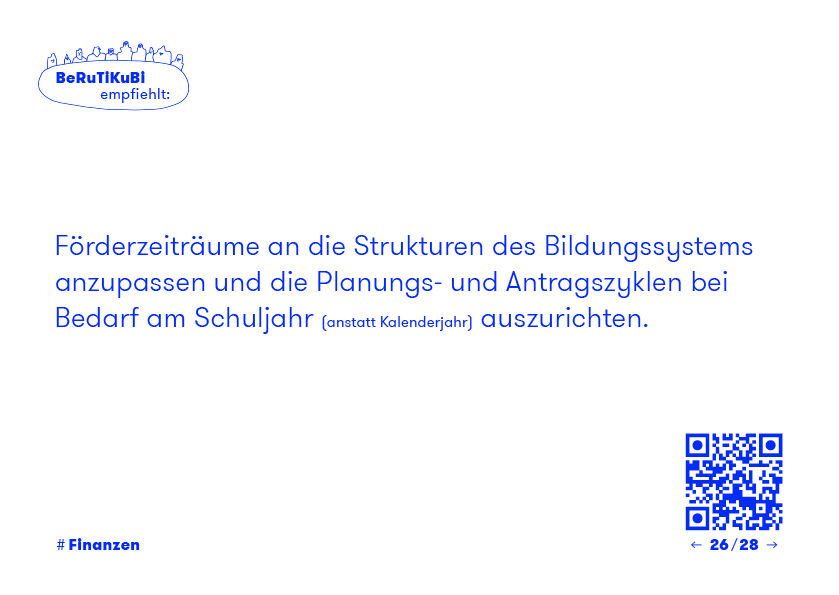 Um dies zu erreichen, empfiehlt der BeRuTiKuBi, die Förderlogiken so weiterzuentwickeln, dass sie den unterschiedlichen Rhythmen der Praxis gerecht werden. Dazu gehören neben der empfohlenen Mehrjährigkeit (Regelfinanzierung und institutionelle Förderung):