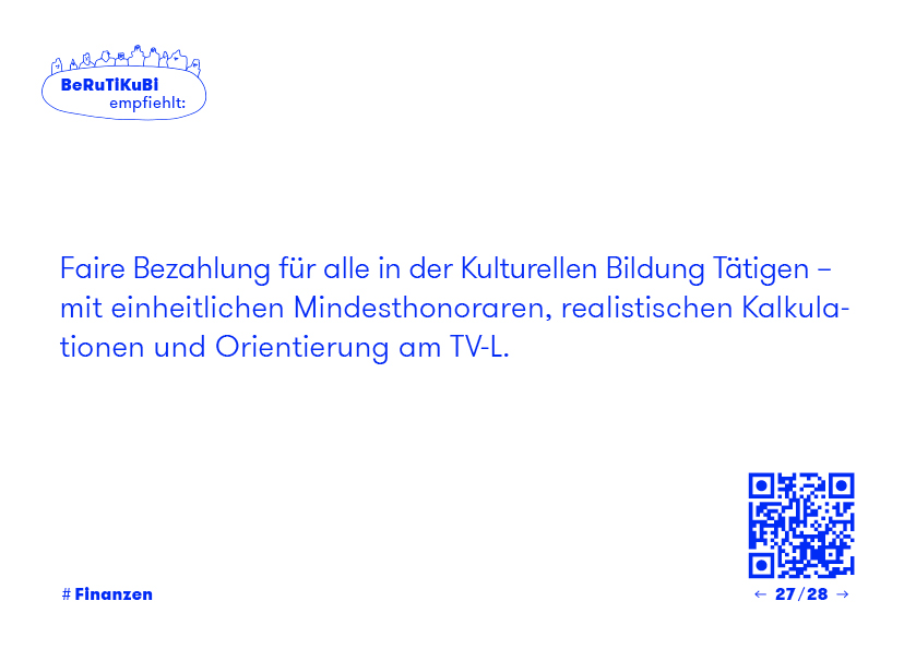 Faire Bezahlung für alle in der Kulturellen Bildung Tätigen – mit einheitlichen Mindesthonoraren, realistischen Kalkulationen und Orientierung am TV-L.