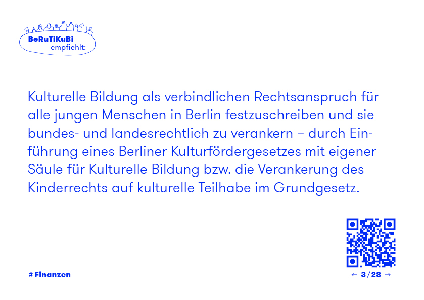 Kulturelle Bildung als verbindlichen Rechtsanspruch für alle jungen Menschen in Berlin festzuschreiben und sie bundes- und landesrechtlich zu verankern – durch Einführung eines Berliner Kulturfördergesetzes mit eigener Säule für Kulturelle Bildung bzw. die Verankerung des Kinderrechts auf kulturelle Teilhabe im Grundgesetz.