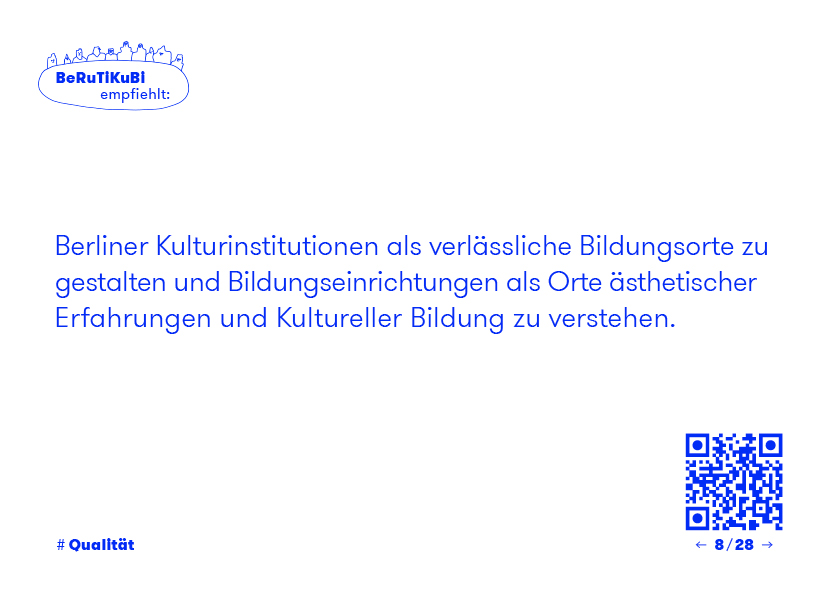Berliner Kulturinstitutionen als verlässliche Bildungsorte zu gestalten und Bildungseinrichtungen als Orte ästhetischer Erfahrungen und Kultureller Bildung zu verstehen.