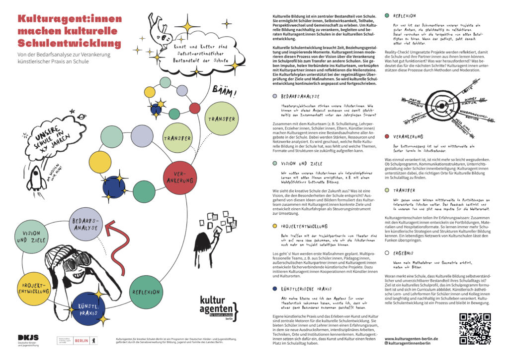 Am Beispiel der Kulturagent*innen-Prozessbegleitung wird deutlich, welche Bausteine für eine adäquate Prozessbegleitung denkbar sind (exemplarisch herausgegriffen): Visualisierung_Arbeitsweise_KA_fin.pdf